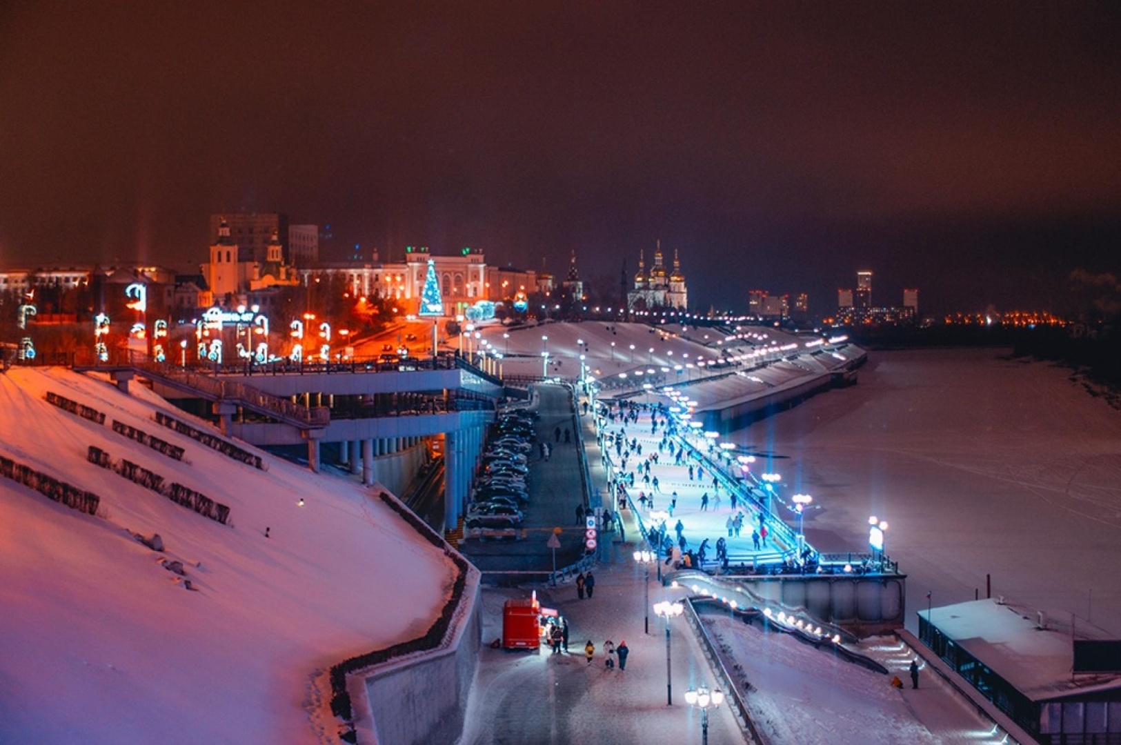 Зимой набережная преображается: каток с музыкальным сопровождением, ледяные горки с выкатом прямо к замерзшей Туре, праздничная иллюминация превращают прогулку в настоящую зимнюю сказку.